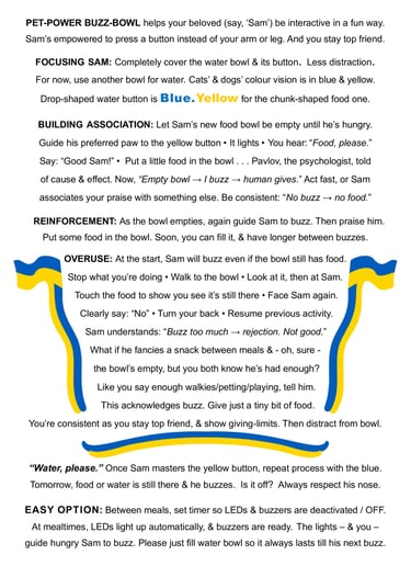 There are viral videos of pets nudging, kicking – even carrying – empty bowls to their humans, & of pets pressing buttons or bells for treats A one-min explainer-video by a top team will include the Pet-Power Buzz-Bowl's use, & overuse (being cheeky), of buttons for Amazon & Alibaba.