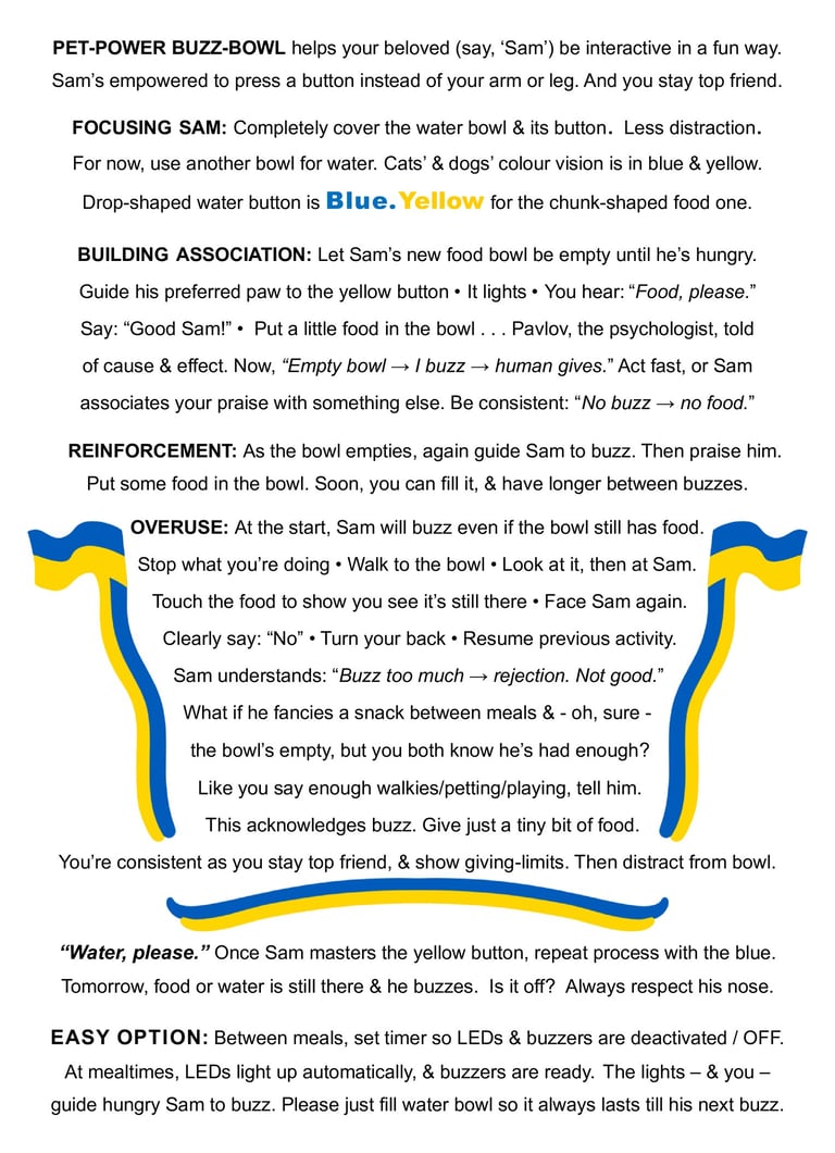 Pet-Power BELL-Bowl pics available. Anyone now with me - once Buzz-Bowl's successful - will work on Bell-Bowl... a purely mechanical, similarly-patented, double-bowl, with a pet-friendly, similarly colour-coded, blue, unique lever-bell for water, & yellow lever-gong for food.
