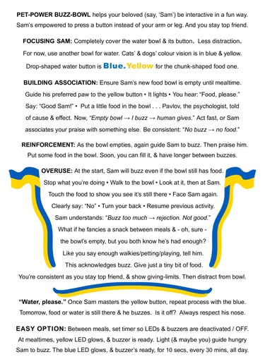 Pet-Power BELL-Bowl pics available. Anyone now with me - once Buzz-Bowl's successful - will work on Bell-Bowl... a purely mechanical, similarly-patented, double-bowl, with a pet-friendly, similarly colour-coded, blue, unique lever-bell for water, & yellow lever-gong for food.
